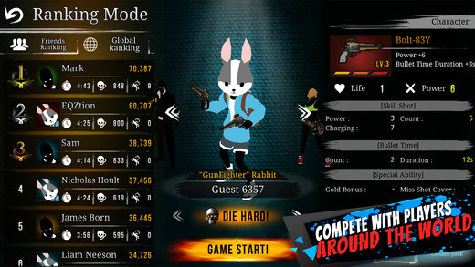 至于内容方面,根据目前官方公布的相关信息,本作将有三名主角供玩家自由选择,他们分别是"鲜肉担当"IVAN、"颜值担当"MARIA以及负责专职卖萌的兔子RABBIT。在游戏当中,他们将会面对来自四面八方的敌人的挑战,当然作为游戏的主角,这些漫游者身上自然也会配备可供升级并且威力强大的各系武器,而游戏的玩法也分为常规关卡以及能够通过网络进行好友PK的Ranking模式。值得注意的是,游戏中还加入了子弹时间的设定,当达到一定条件时,我们便可以释放这一技能,在定格的时间之中快速击杀敌人。